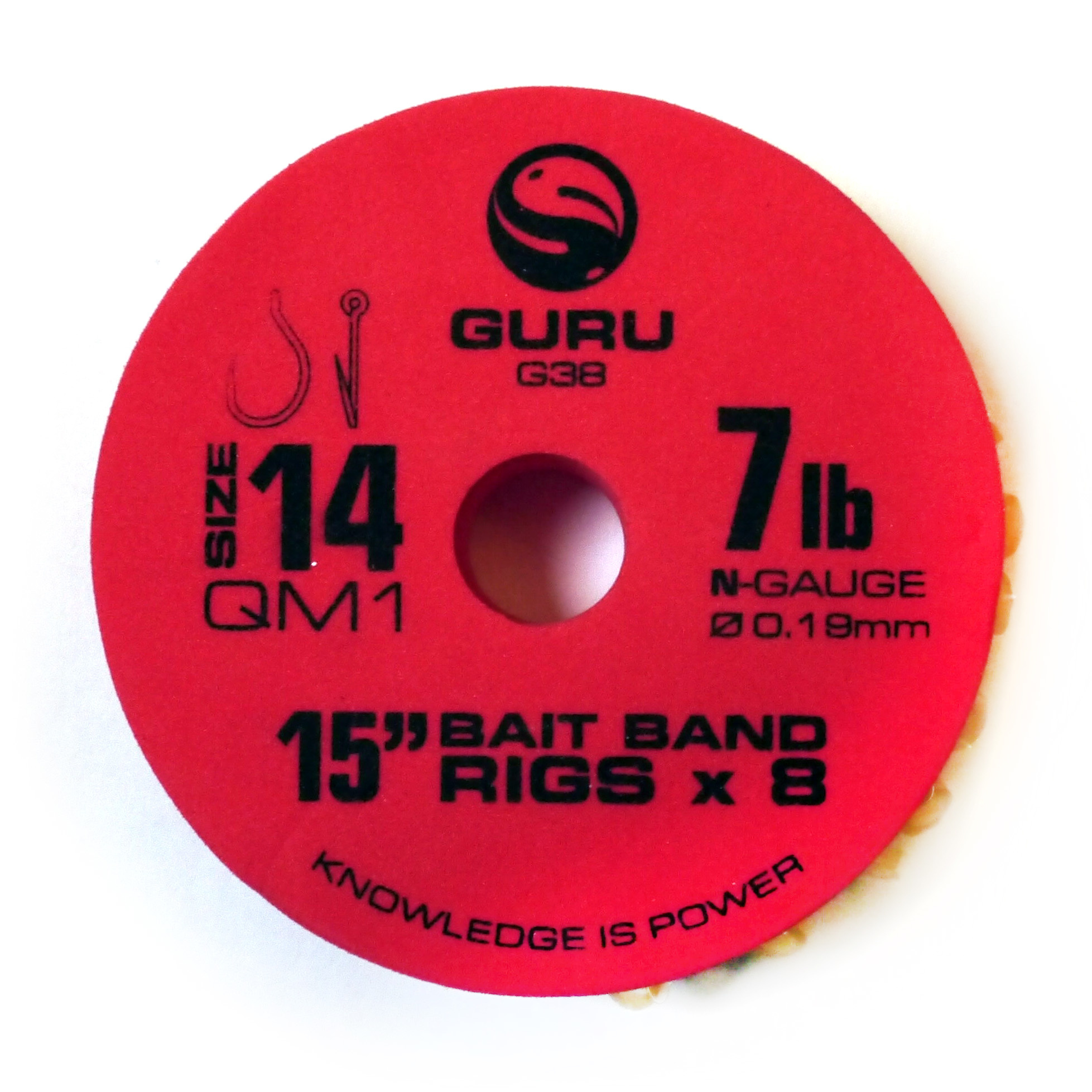 Deze perfect gebonden onderlijnen zijn ideaal geschikt voor alle method feeder visserij. Met de Guru QM1 Ready Rig 15” Bait Bands kun je heel makkelijk je haakaas op de hair zetten, door door de stiek om het haakaas te doen. Deze onderlijnen worden geleverd met een EVA spool die in de Guru Rig Case past. Deze onderlijnen zijn voorzien van QM1 haken en N-Gauge onderlijn materiaal. Tevens passen deze onderlijnen perfect in de Guru Rig Case, zodat de opslag van veel onderlijnen geen probleem is. Iedere spoel bevat 8 onderlijnen.