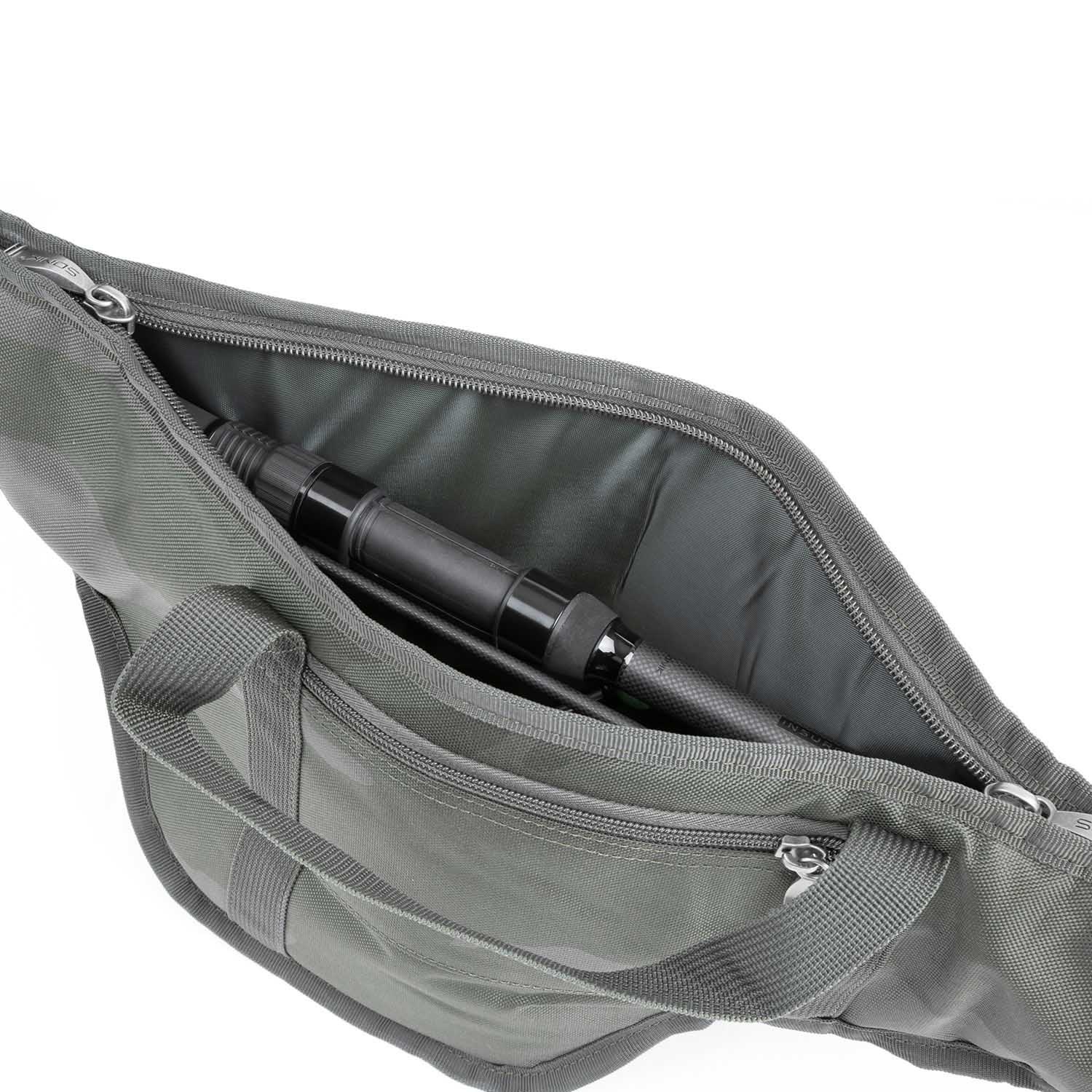 Die seitliche praktische Tasche und der Gurt eignen sich perfekt für Gegenstände wie einen Kescher. Die gegenüberliegende Seite verfügt über eine Reißverschlusstasche für Bleie und Gurtbänder für zwei Banksticks.