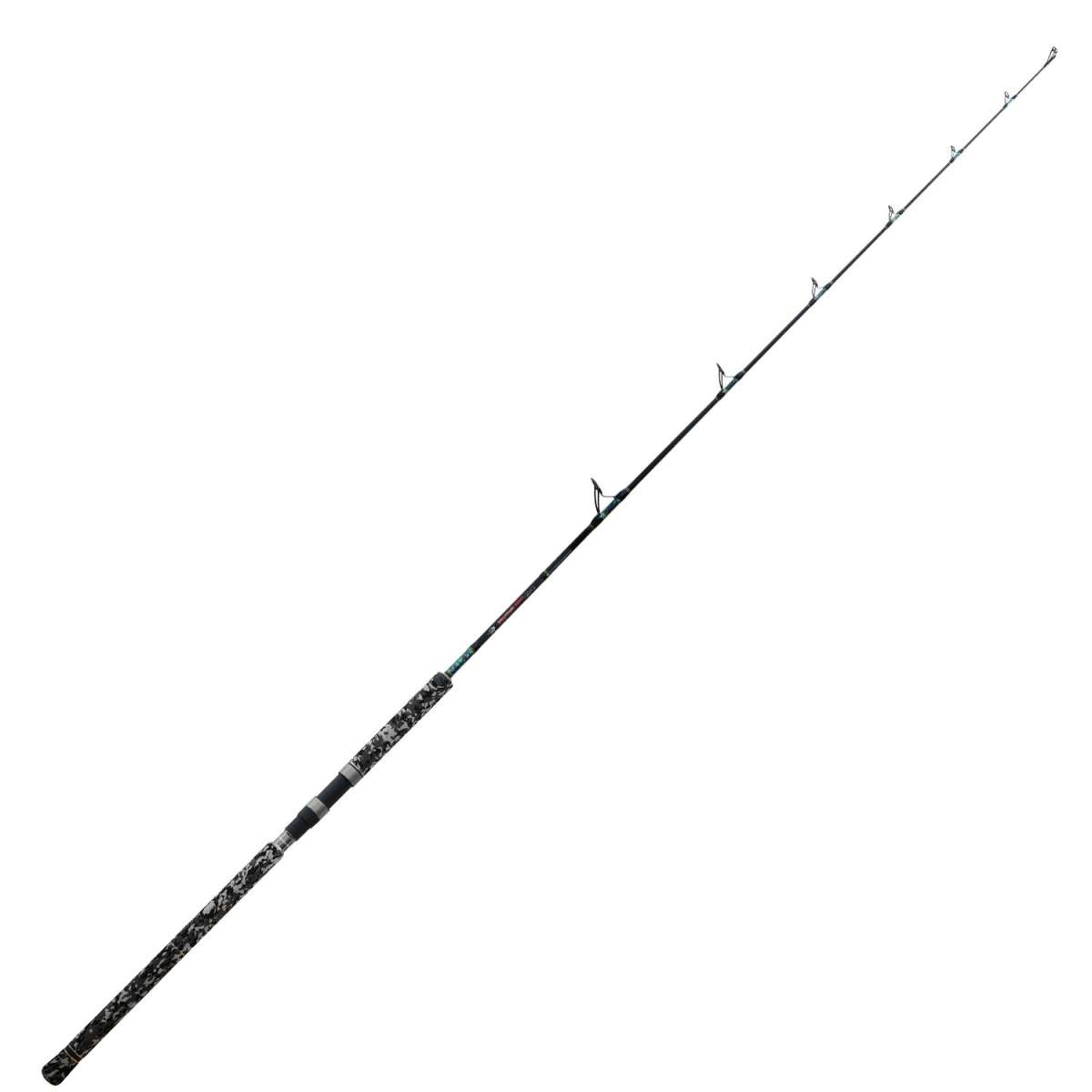 It is equipped with Fuji KW guides and a Fuji DPS reel seat, components that ensure durability and smooth performance. The rod's semi-parabolic action delivers balanced control when battling powerful species, making it suited for targeting tuna, catfish, and other sizable pelagic fish. The handle features a gray camo EVA coating.