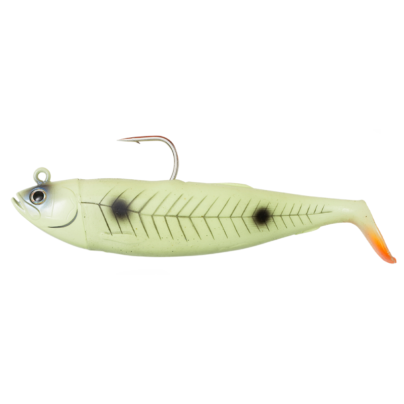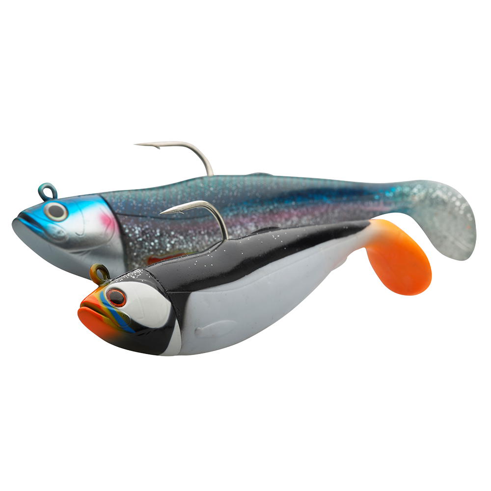 These giant softlures are designed primarily for big saltwater game fish – like Halibut and giant cod. We have taken offspring in the Atlantic herring, the most important prey fish for the Atlantic saltwater predators. The lures have been designed in co-operation with some of Scandinavia’s most experienced saltwater big fish guides and we have worked to achieve superior swimming action, perfected customized Japanese forged hooks with unparalleled hooking ability and strength. Our unique “under skin” painting technique enables us to make each lure look incredibly lifelike. The chosen colours are based on input from the most successful guides in the Nordic saltwater guiding business. Cutbait herring, a superior big fish lure!