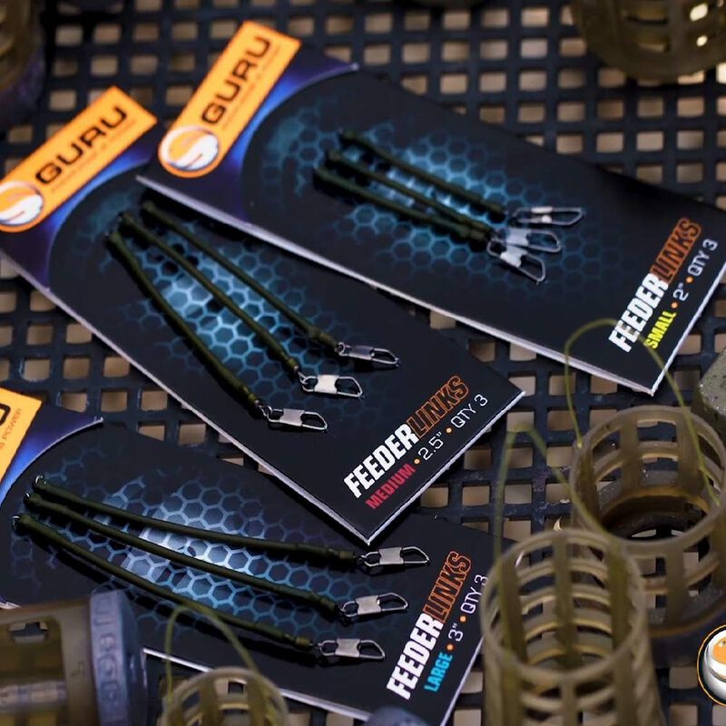 De Guru Feeder Links maken de ideale connectie tussen de feederkorf en de hooflijn, de stijve tubing verhindert in de war werpen. Met Quick Change warteltje en Free Running systeem. Deze manier om de korf te bevestigen bevordert de beetdetectie. Volgens de CIP's regels. Te gebruiken met de Guru Open End, Window en Maggot Feeders.