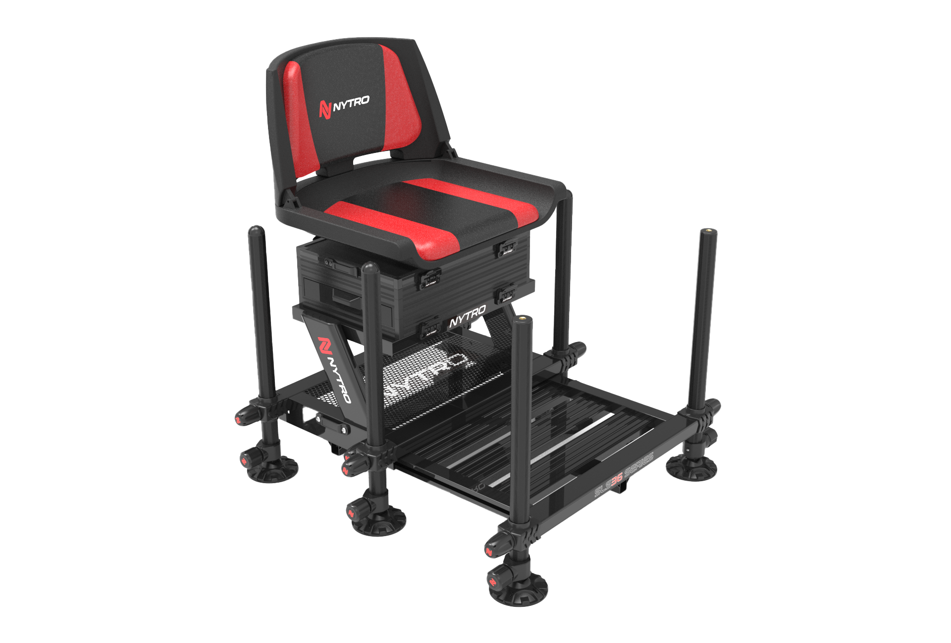 The Nytro SLS36R station with swivel seat offers even more comfort and great value for money! Just like the SLS36 station the SLS36R is a compact, space efficient seat box featuring a 360° swivel seat. It has an elegant, strong aluminium frame with a rigid sliding foot plate and six D36 black telescopic legs, two of which feature a threaded end cap. There are two spirit levels, located on the back and the side of the frame to allow perfect positioning. A fantastic seat box for the demanding pole and feeder angler.