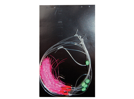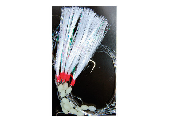 Deze makreelonderlijnen van Arca zijn geknoopt op 40/00 & 60/00 nylon en 5 Flash haken #6 & 4, 3/0. Voor elke haak zitten een lichtgevende parel. Met lus boven- en onderaan. Ideaal voor de makreel.