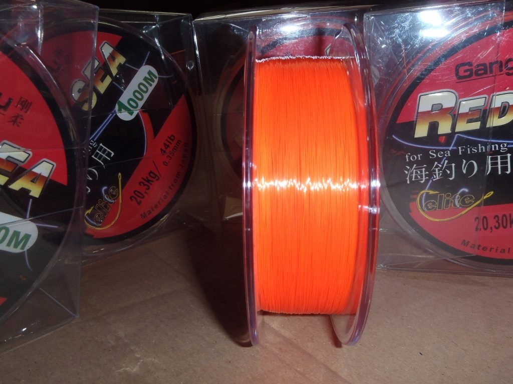 Goed zichtbare fluo oranje zee nylon. Uitstekende prestaties op zout water. Verkrijgbaar 0,25mm; 0,30mm; 0,35mm op spoelen van 100m.